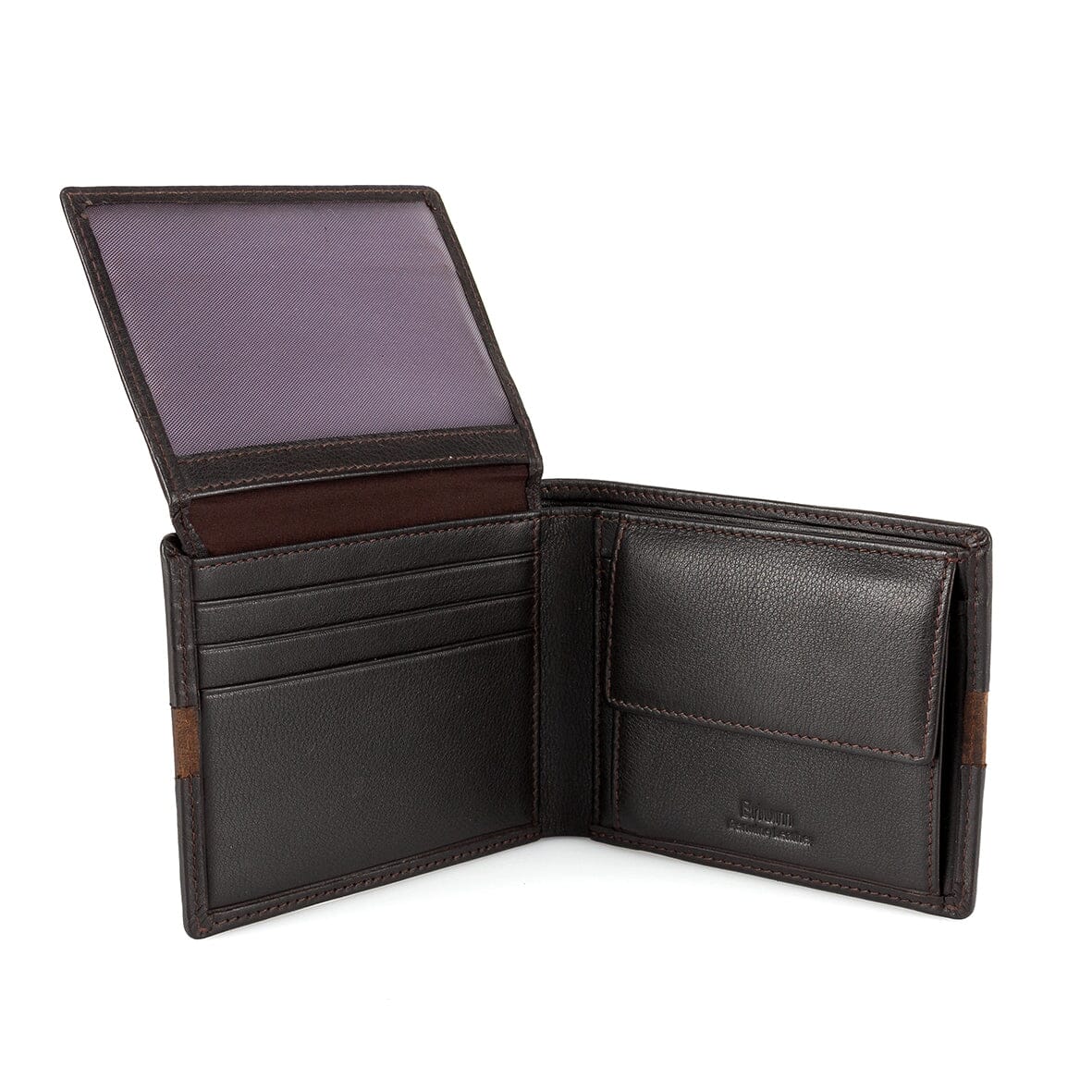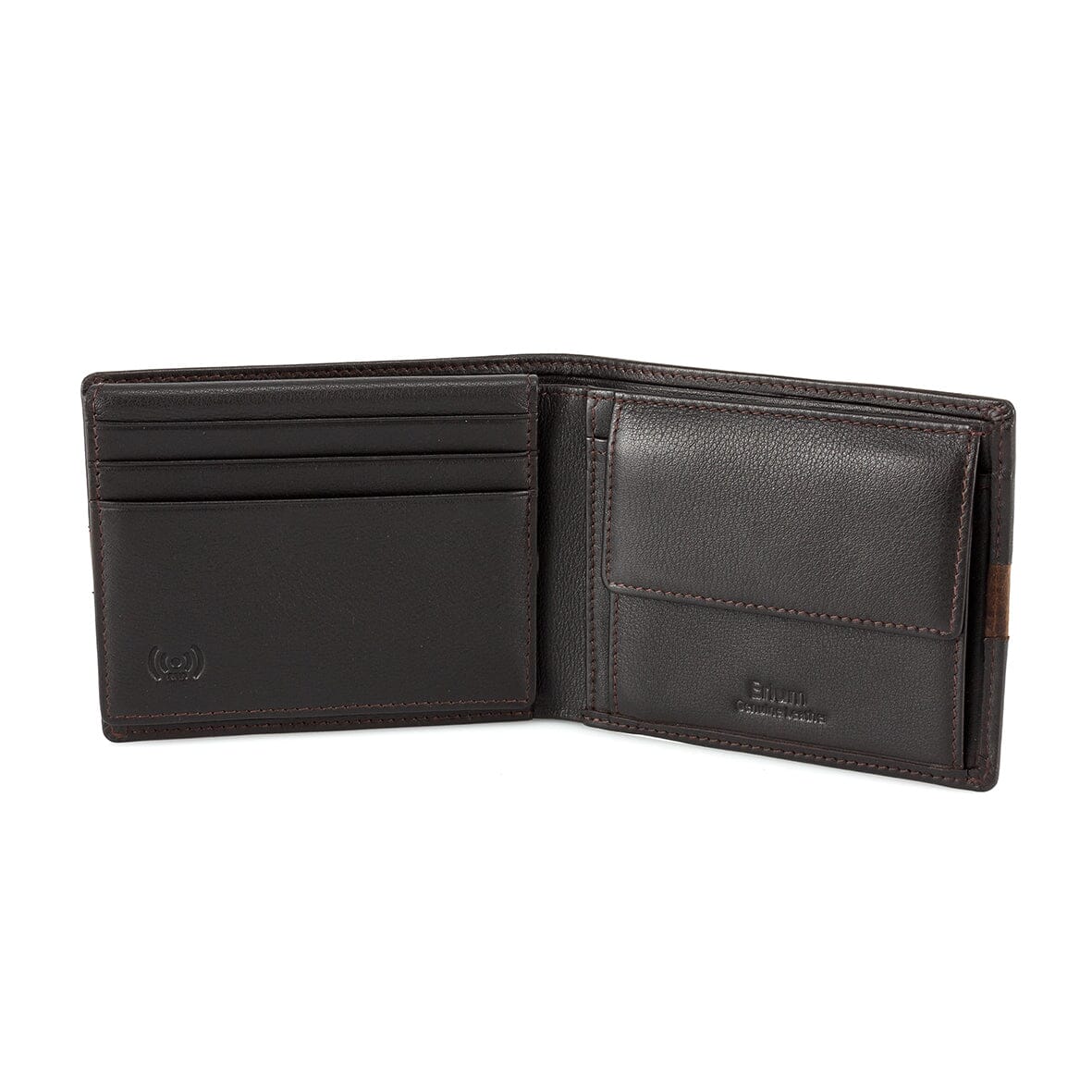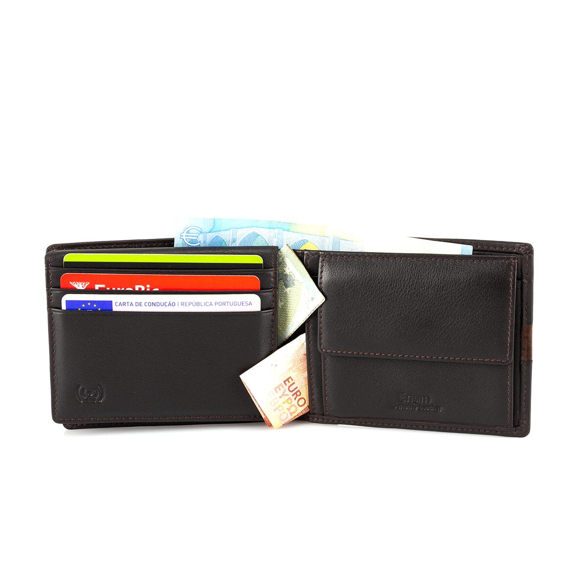 Carteira Erium com espaço para seis cartões, uma transparência, duas arrumações interiores, um porta-moedas e uma divisão para notas. Com proteção RFID*.