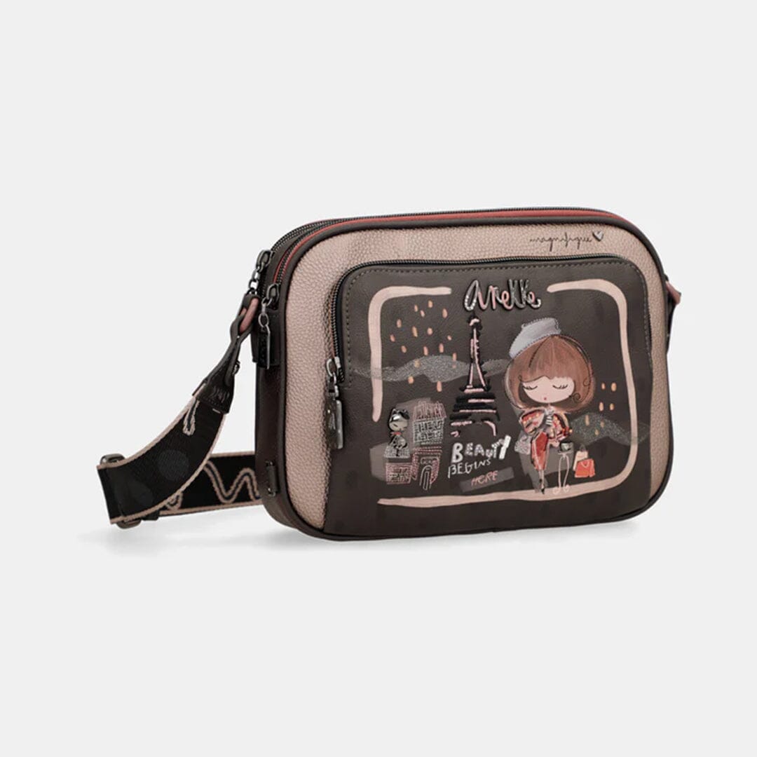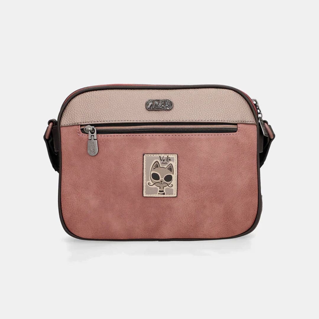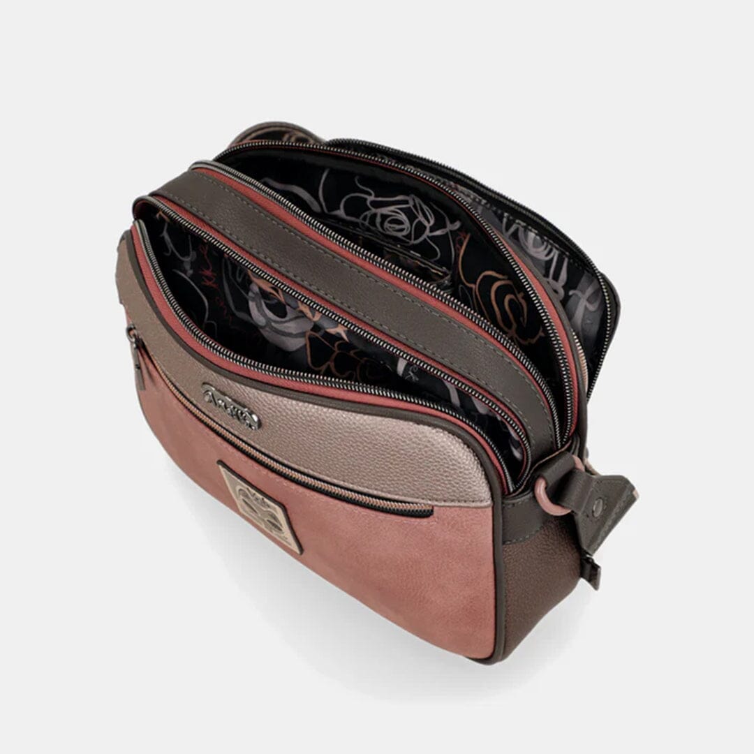 Mala de tiracolo Anekke com dois compartimentos principais com fechos, tiracolo amovível e ajustável, bolsos exteriores com fechos. Interior com bolso com fecho e multiusos.