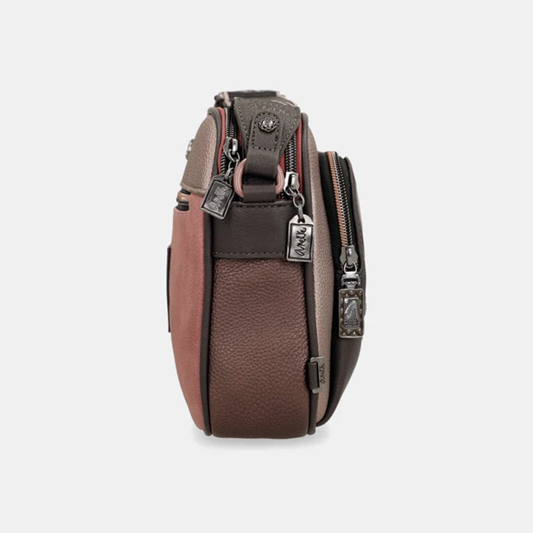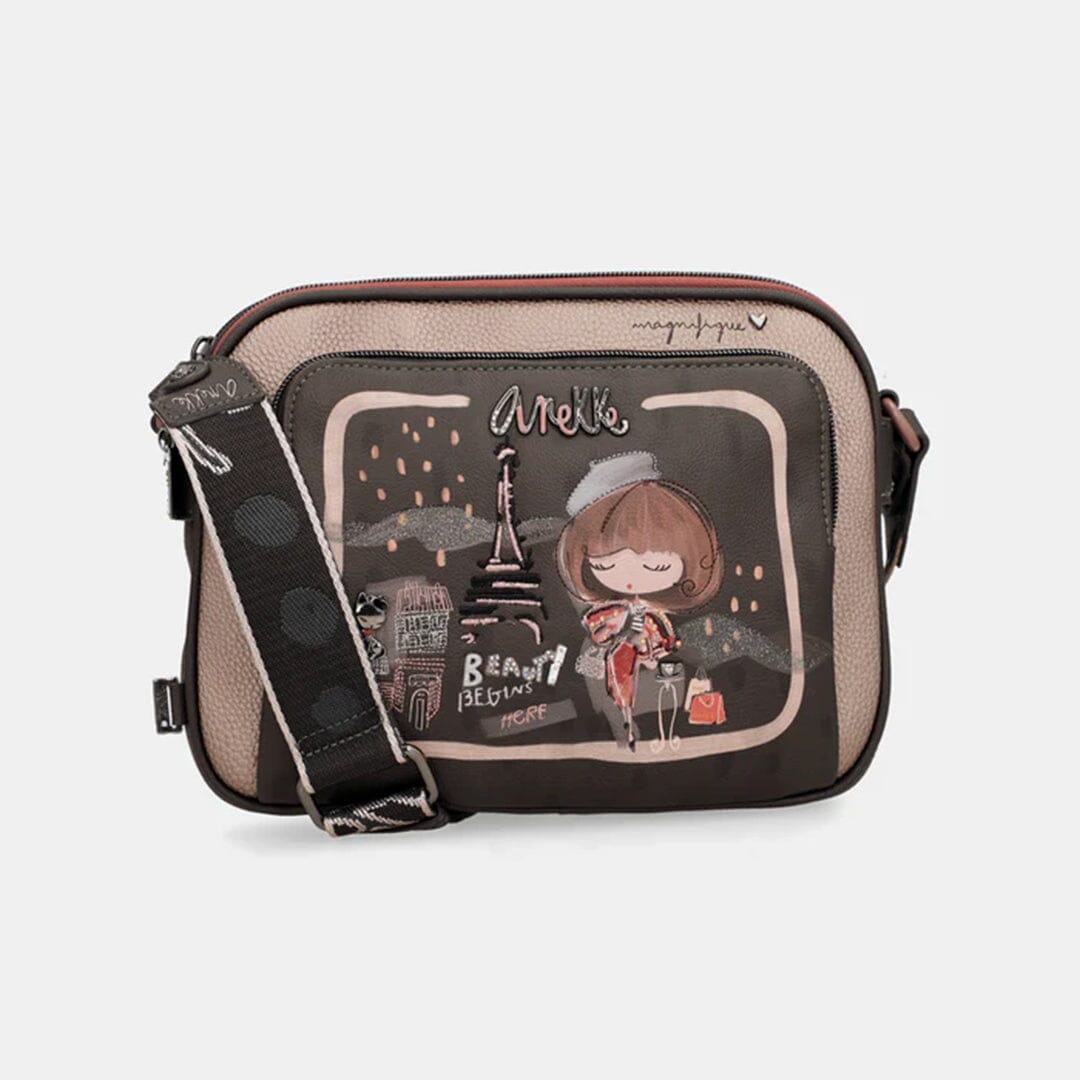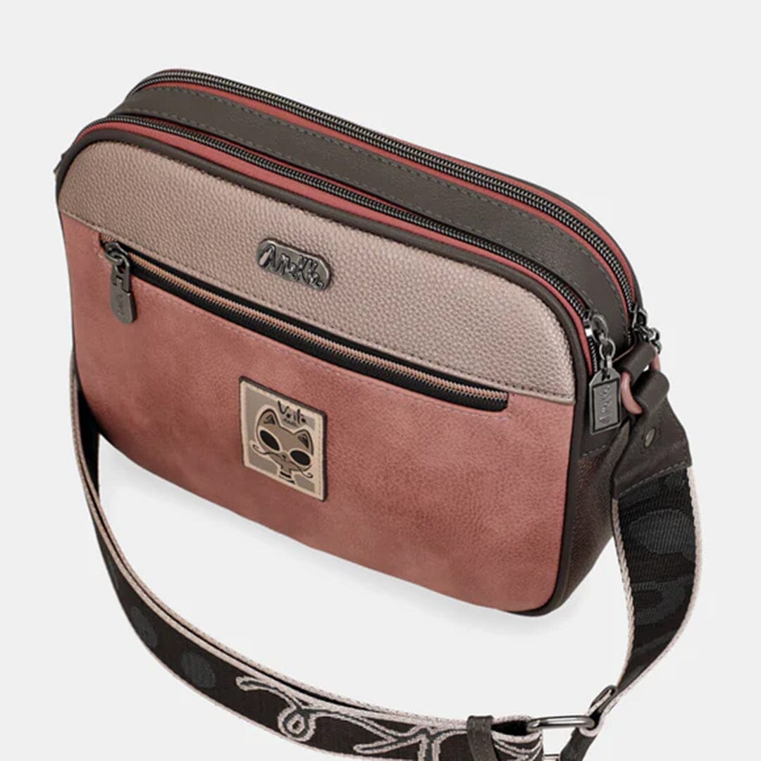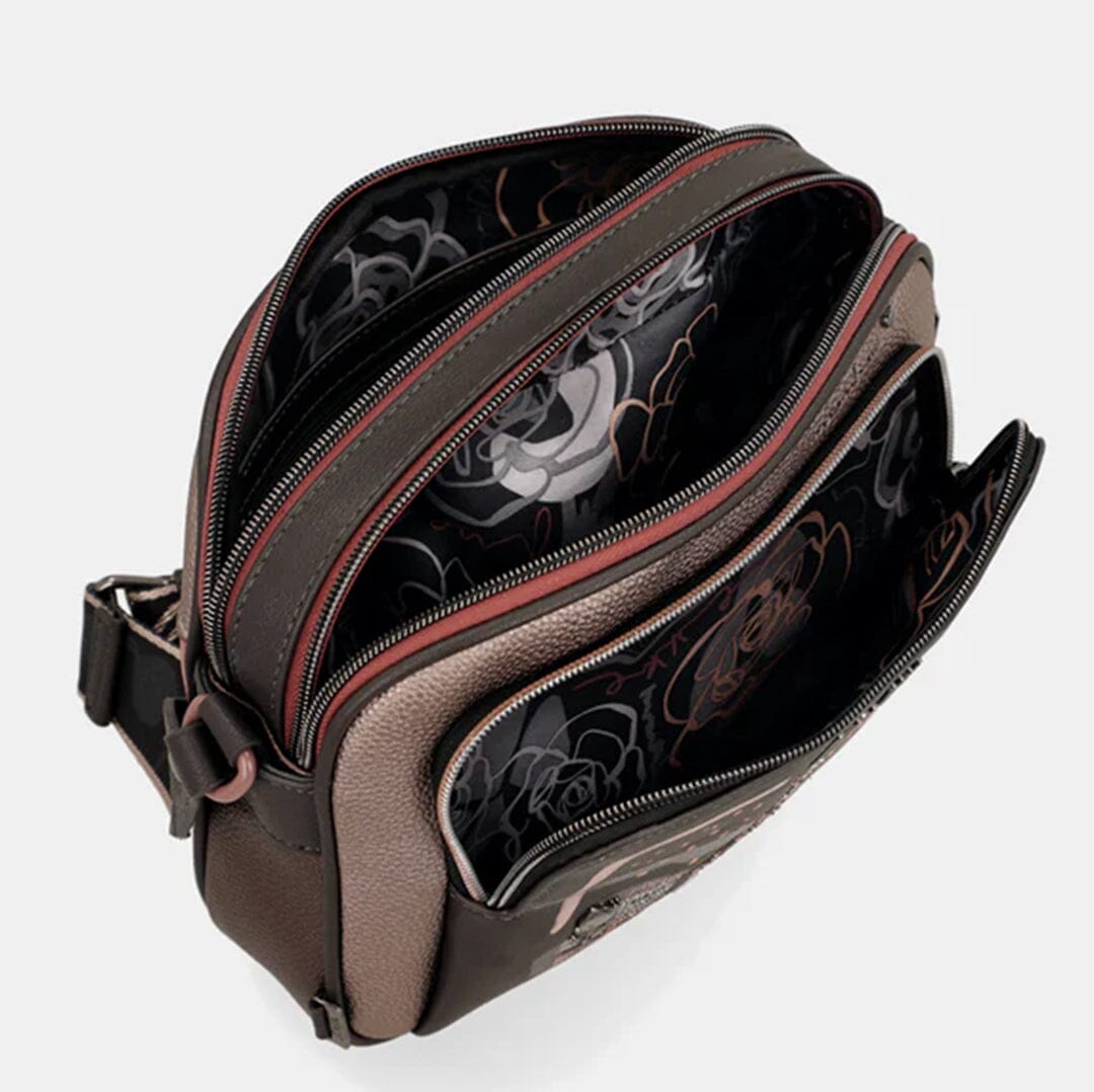 Mala de tiracolo Anekke com dois compartimentos principais com fechos, tiracolo amovível e ajustável, bolsos exteriores com fechos. Interior com bolso com fecho e multiusos.