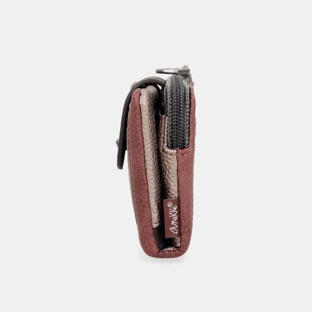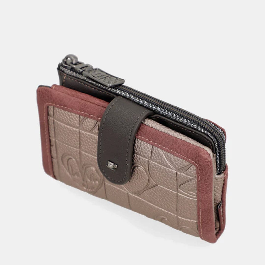 Carteira Anekke com um compartimento com fecho para as moedas, compartimento com presilha e mola magnética com espaço para cartões, arrumação interior e divisão para notas. Com proteção RFID.