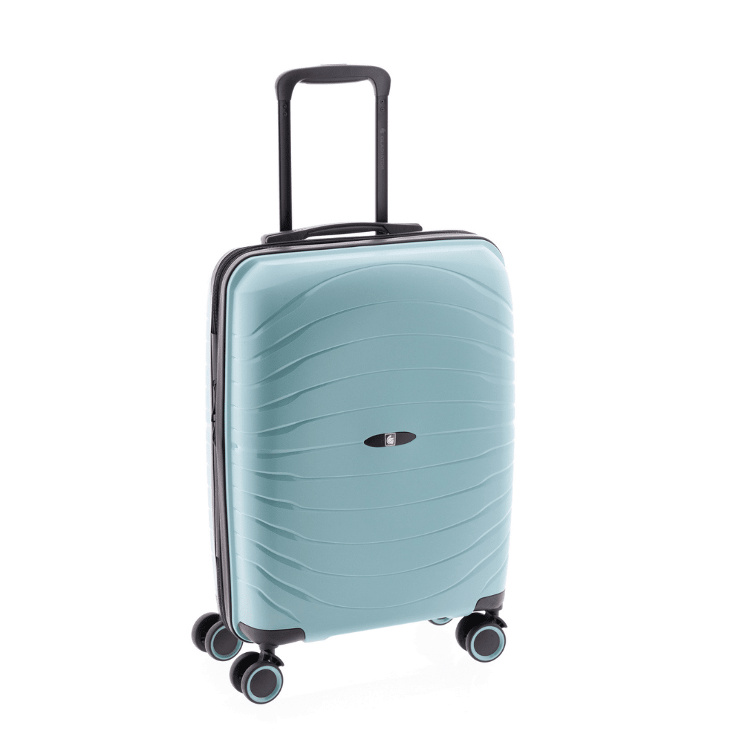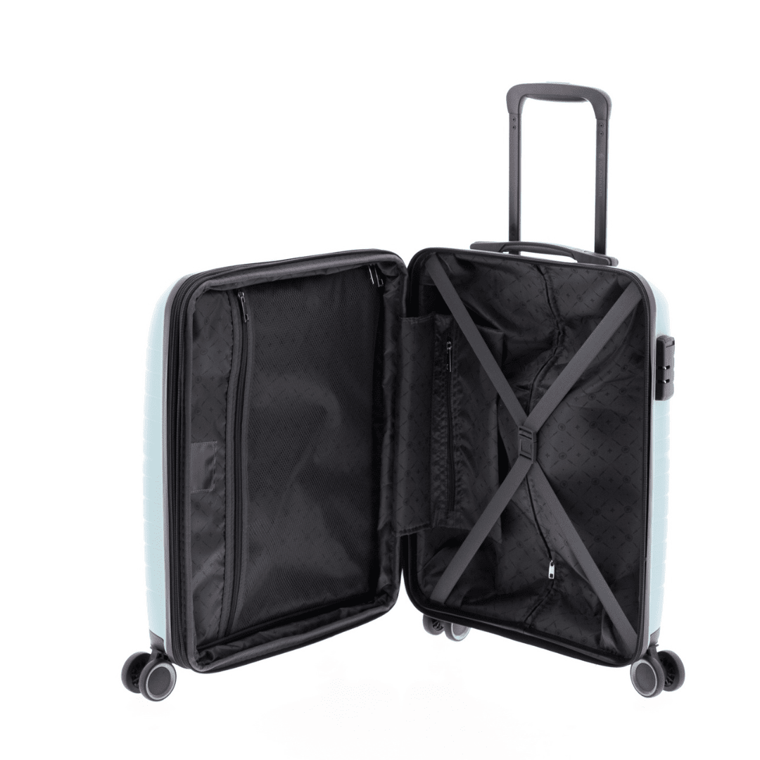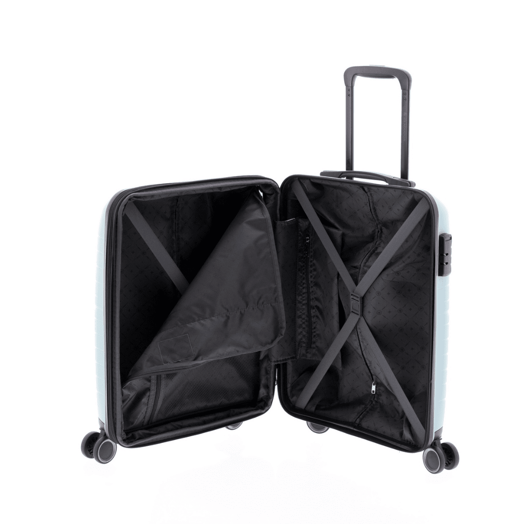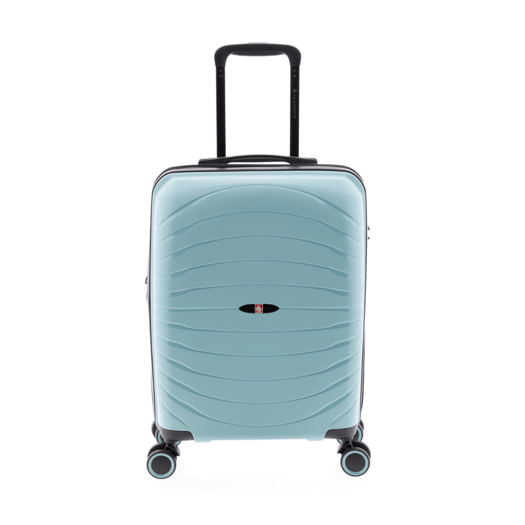 Mala de cabine expansível Gladiator com fecho de combinação com três dígitos, uma pega superior, trolley extensível com botão para ajustar e quatro rodas duplas. O interior contém um compartimento com divisão forrada com fecho e um compartimento com cintas ajustáveis.