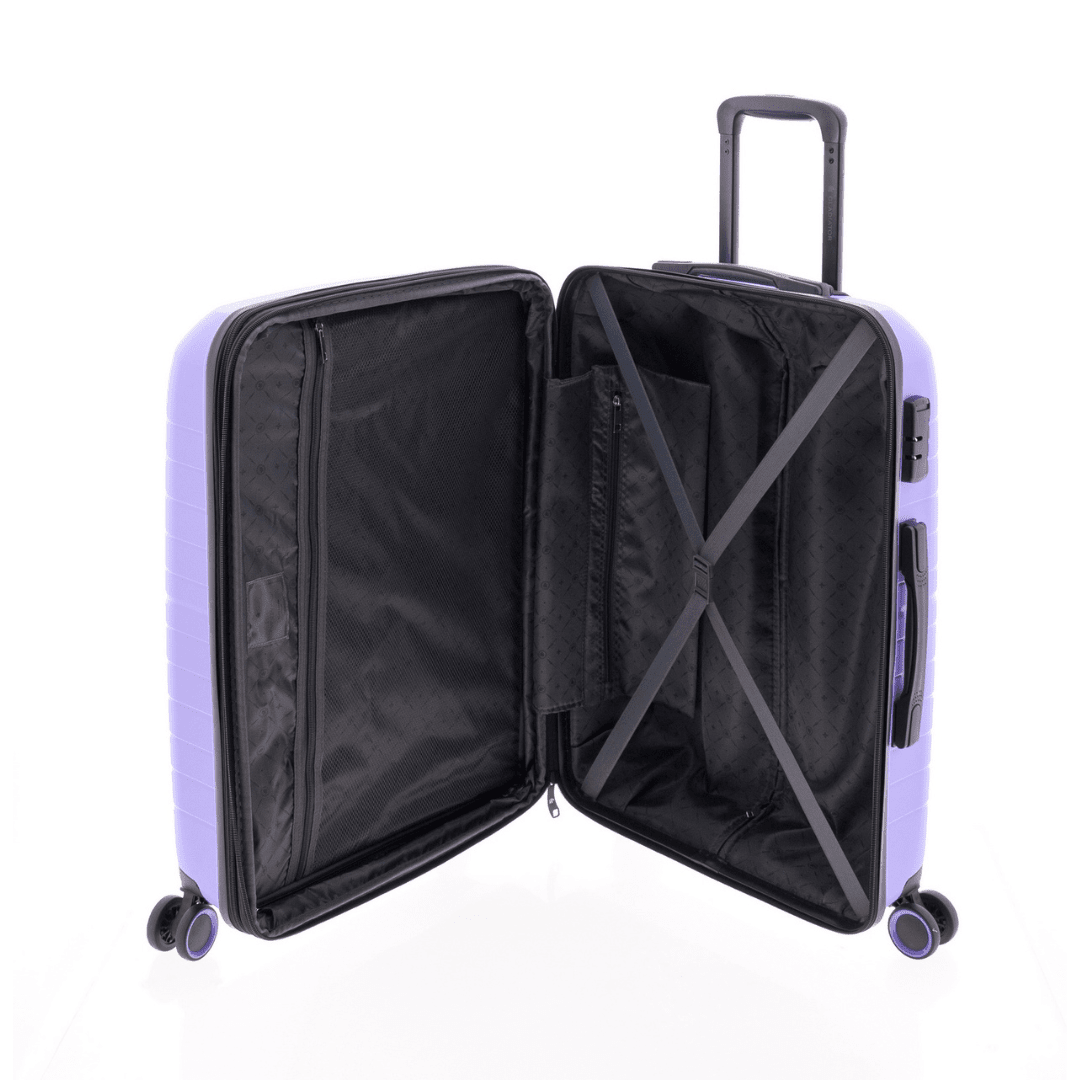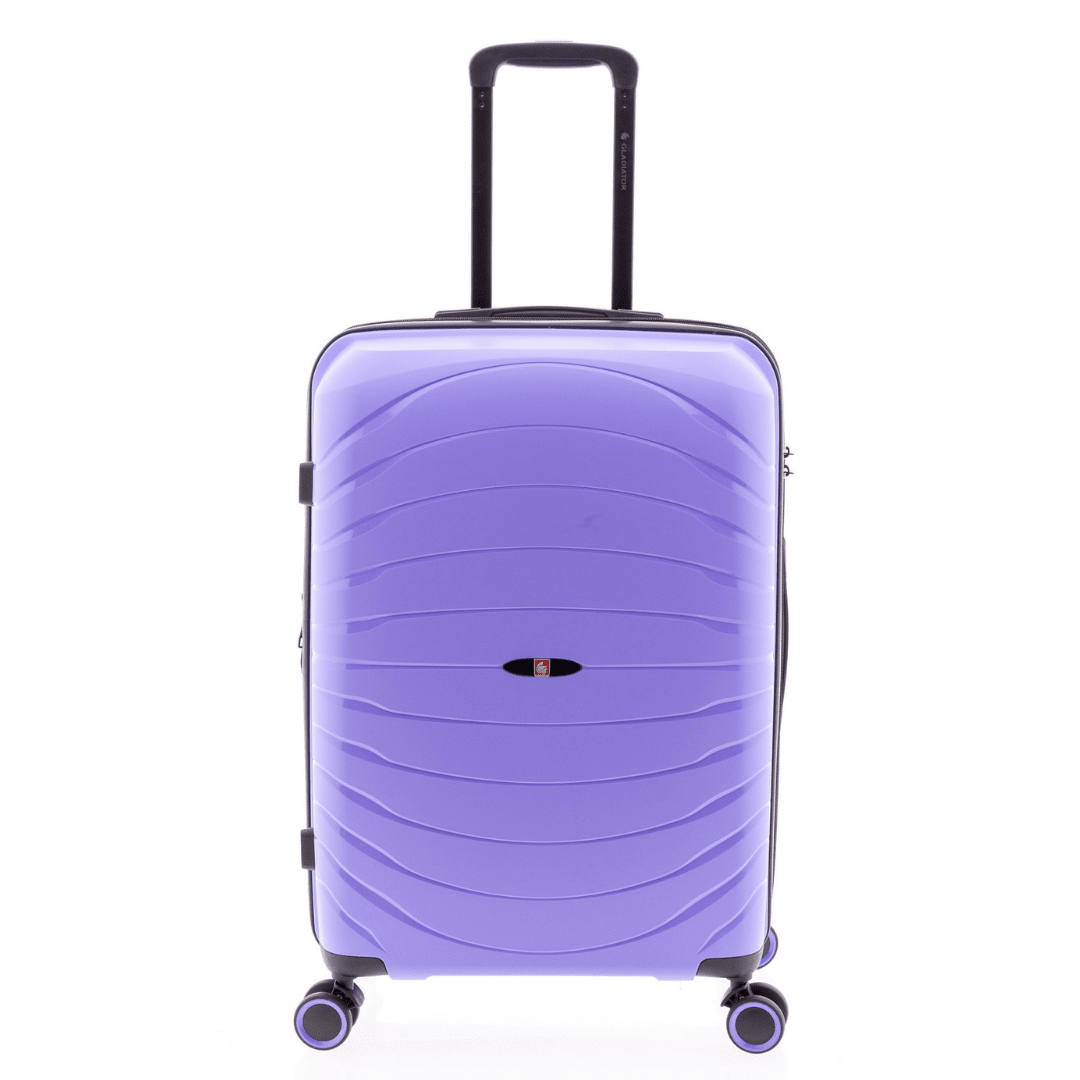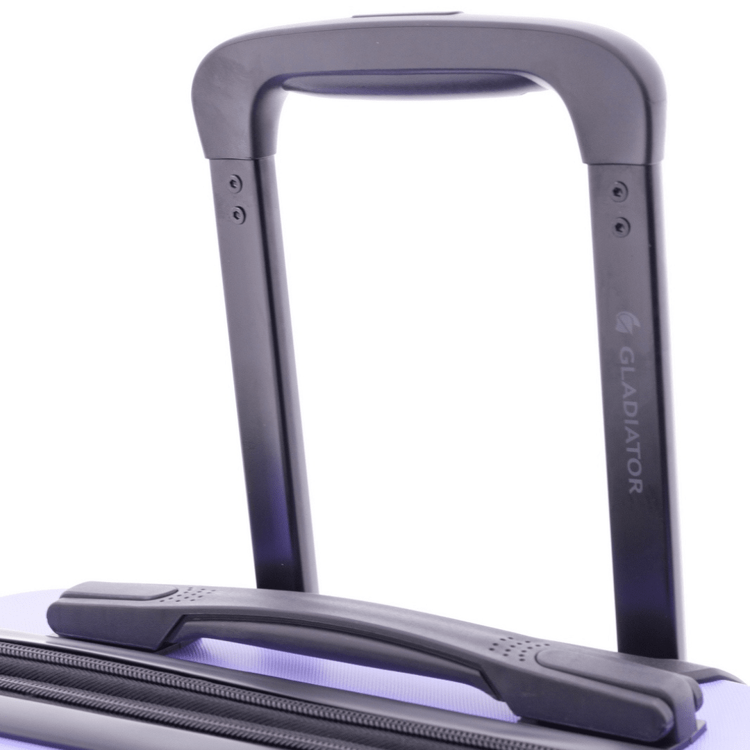 Mala de viagem média expansível Gladiator com fecho de combinação com três dígitos, pega superior e lateral, trolley extensível com botão para ajustar e quatro rodas duplas. O interior contém um compartimento com divisão forrada com fecho e um compartimento com cintas ajustáveis.