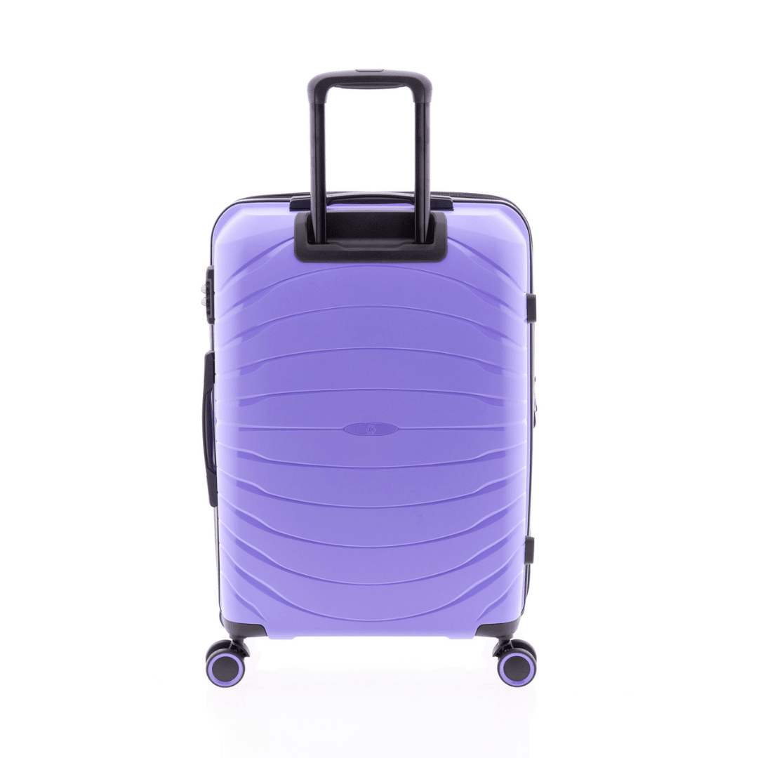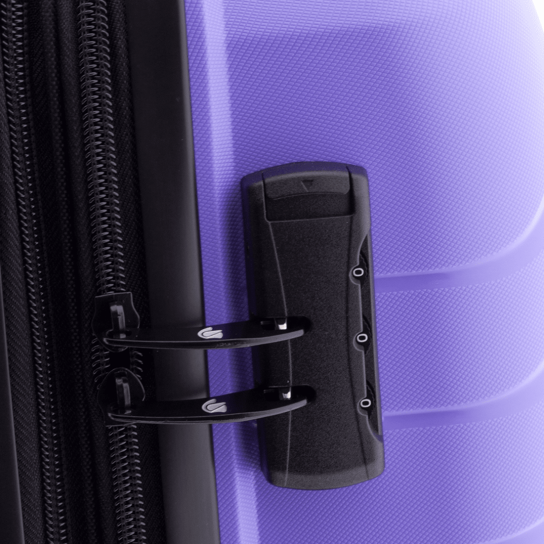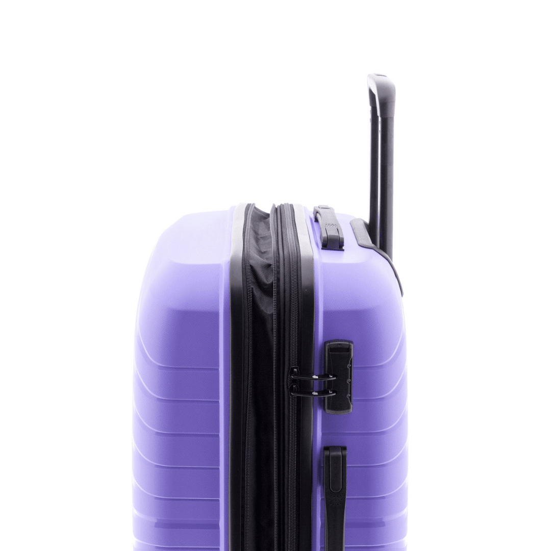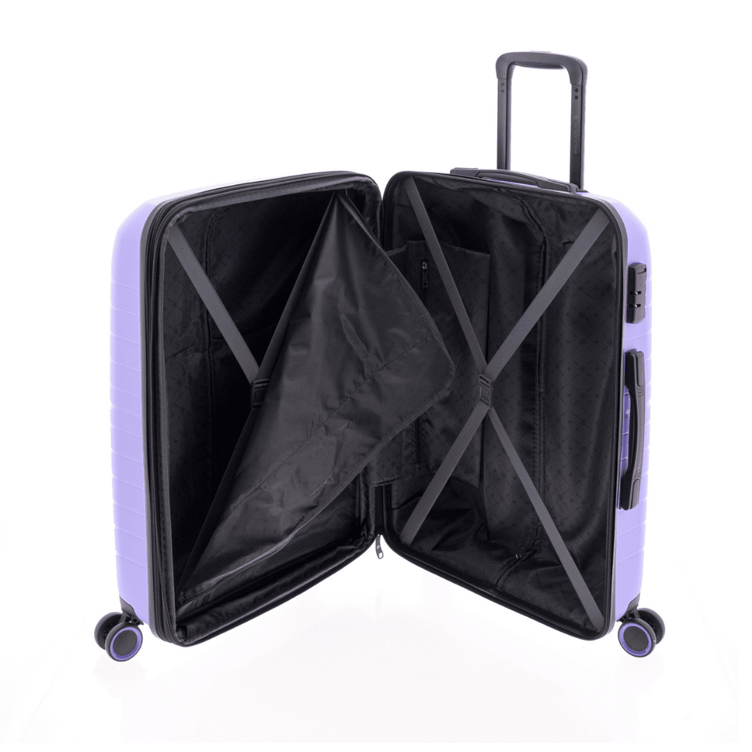 Mala de viagem média expansível Gladiator com fecho de combinação com três dígitos, pega superior e lateral, trolley extensível com botão para ajustar e quatro rodas duplas. O interior contém um compartimento com divisão forrada com fecho e um compartimento com cintas ajustáveis.