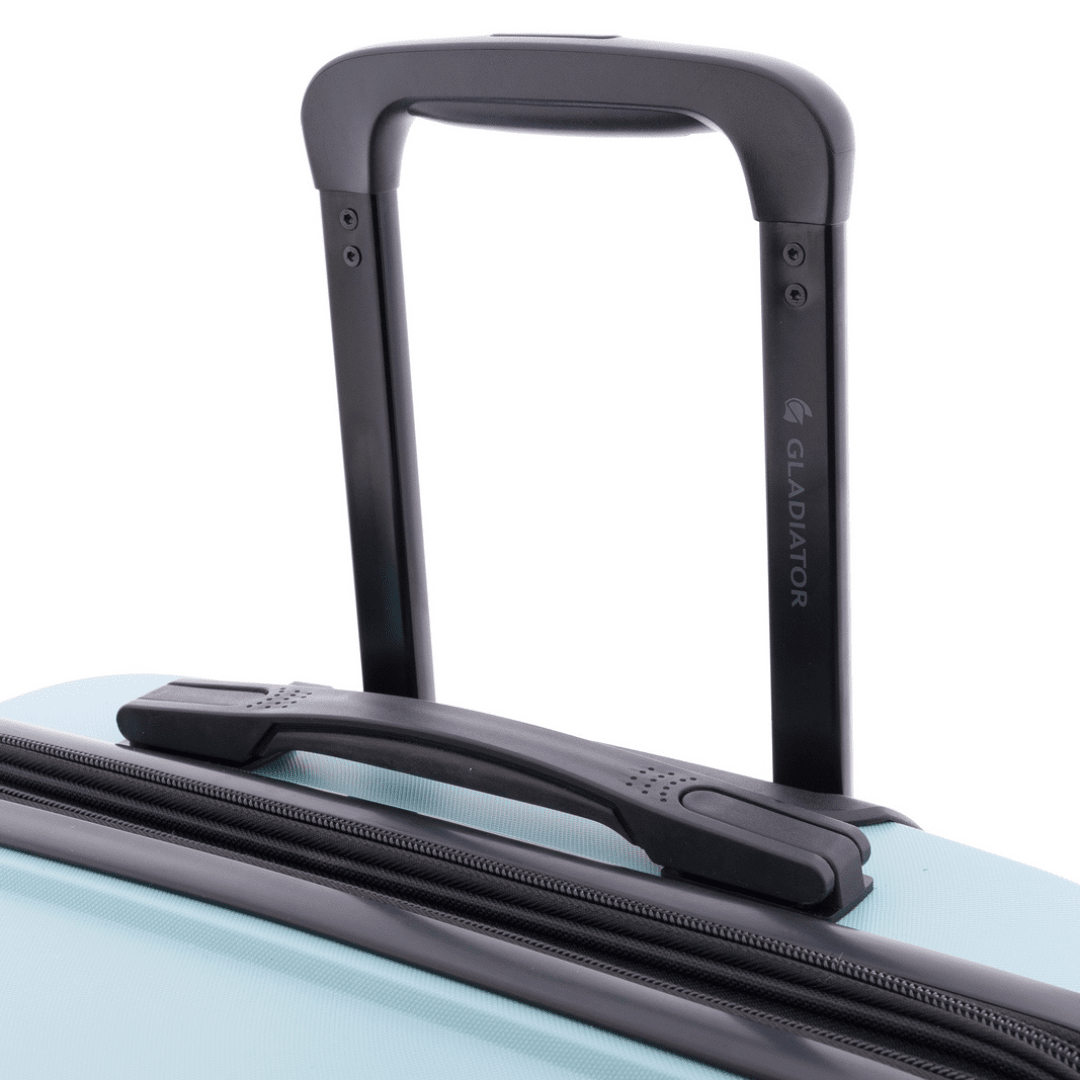 Mala de cabine expansível Gladiator com fecho de combinação com três dígitos, uma pega superior e lateral, trolley extensível com botão para ajustar e quatro rodas duplas. O interior contém um compartimento com divisão forrada com fecho e um compartimento com cintas ajustáveis.